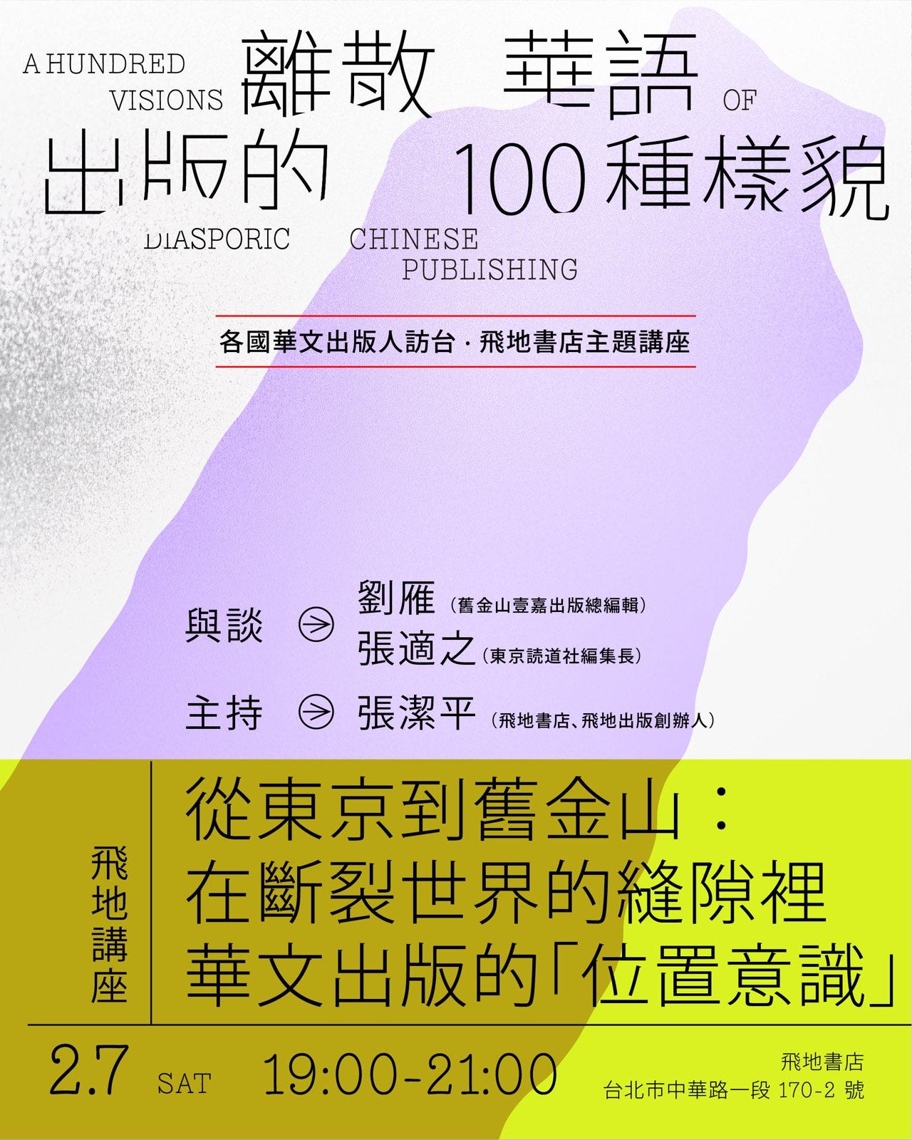 2 月 7 日,更将与洁平、读道社编集长张适之,一起就海外华语出版的 “位置意识” 展开对谈。